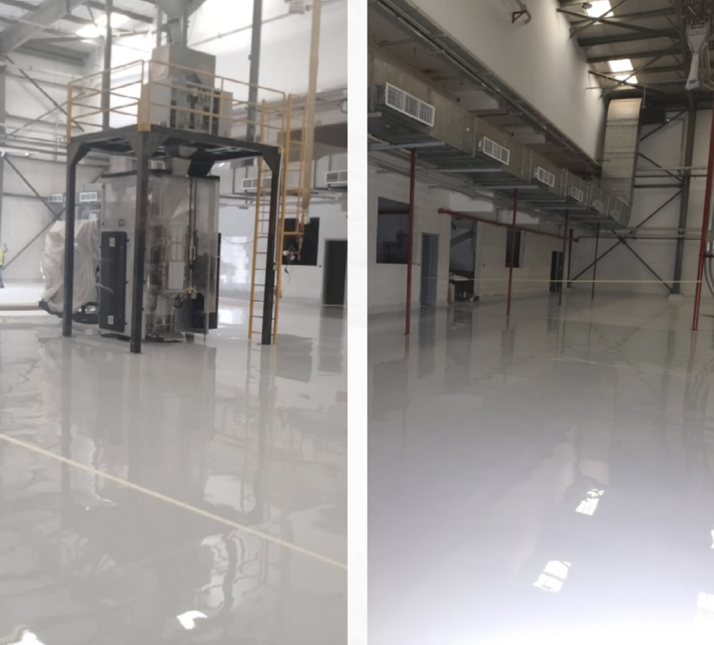 The floors are completely finished with self-leveling epoxy in the customer’s preferred colors, as there are many colors available for epoxy flooring systems.